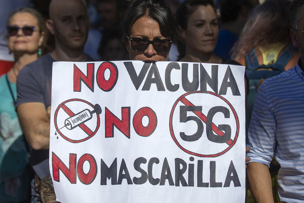 스페인 마드리에서 집회 참가자가 “백신 반대, 5G 반대, 마스크 반대”라는 구호가 적힌 손팻말을 들고 있다. AP 연합뉴스