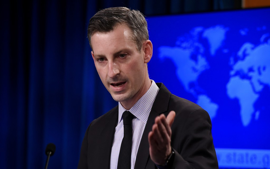 네드 프라이스 미국 국무부 대변인이 언론 브리핑에서 발언하고 있다.