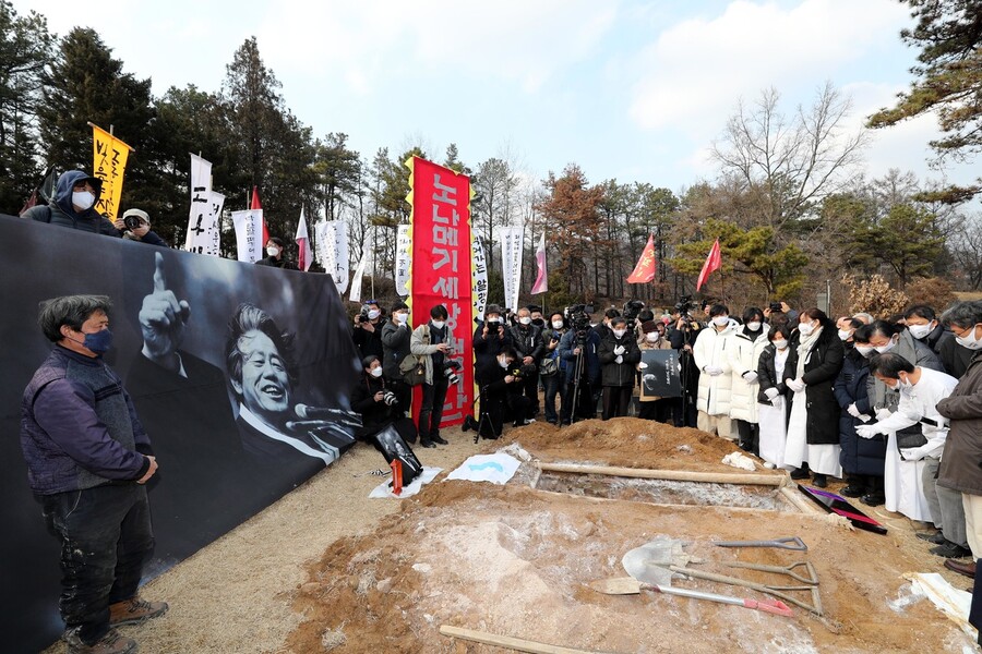 고 백기완 선생의 영결식이 열린 19일 오후 경기도 남양주시 모란공원묘지에서 유가독들과 시민 노동자들이 참여한 가운데 하관식 및 평토제를 하고 있다.
