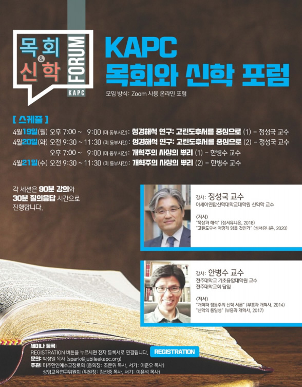 미주한인예수교장로회(KAPC, 총회장 조문휘 목사)는 상임교육연구위원회(위원장 김선중 목사) 주관으로 4월 19일부터 21일까지 4차 목회와 신학 포럼 진행한다. 진행방식은 줌을 통한 화상이다.