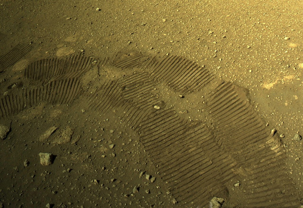 이 사진에는 예제로 크레이터의 붉은 토양에 퍼서비어런스가 움직이며 남긴 바퀴 자국이 선명하게 보인다.