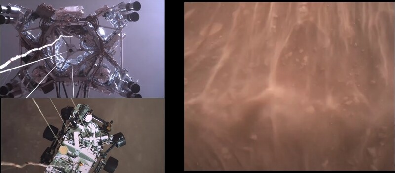 고도 20미터에서 하강선이 줄을 내려뜨려 퍼시비런스를 착륙시키는 장면(왼쪽)과 역추진 엔진에 의해 먼지바람이 일고 있는 모습. 퍼시비런스의 카메라가 동시에 위와 아래 쪽을 향하면서 찍은 영상이다.