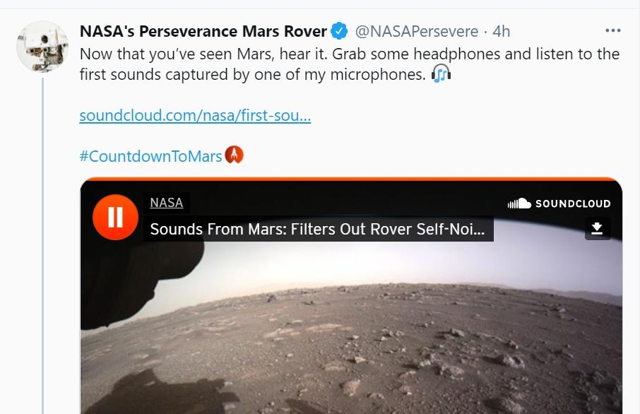 퍼서비어런스는 트위터를 통해 "헤드폰을 끼고 내 마이크 중의 하나가 잡아낸 첫 번째 (화성의) 소리를 들어보라"고 말했다.