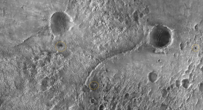 화성 정찰궤도선(MRO)에서 촬영한 퍼시비런스 착륙지역. 노란색 동그라미 안의 물체는 왼쪽부터 하강선, 퍼시비런스, 열 차폐막이다. 나사 제공
