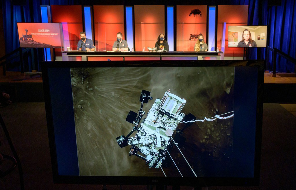 탐사 로버 하강 장면을 공개하는 NASA 기자회견 [AFP/NASA=연합뉴스]