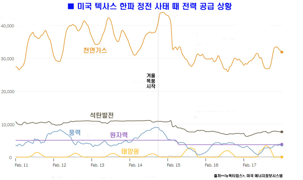지난 14∼15일 북극발 한파가 텍사스를 강타해 470만 가구와 사무실에 전기와 난방이 끊기고 수십명의 인명피해가 발생했다. 대규모 정전사태가 발생한 가장 근본적인 원인은 텍사스주 발전소들이 눈 폭풍을 동반한 혹한에 대한 대비책을 마련해놓지 않았다는 점이라고 <뉴욕타임스> 등 미국 언론들은 지적했다. 겨울철 텍사스 전력공급의 대부분을 담당하는 가스와 석탄화력발전에서 2만9천㎿가 정전되고, 풍력발전에선 1만6천㎿가 끊겼다. 4기의 원전 가운데 1기도 멈췄다. 텍사스 전력원에서 2010년 전체의 40%를 차지하던 석탄화력발전은 지난해 18%로 줄어든 반면, 풍력발전은 23%까지 상승했다.