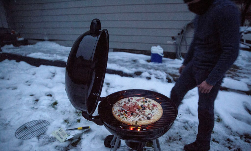 바비큐 그릴에 불을 피워 피자를 데우는 텍사스 주민[로이터=연합뉴스]