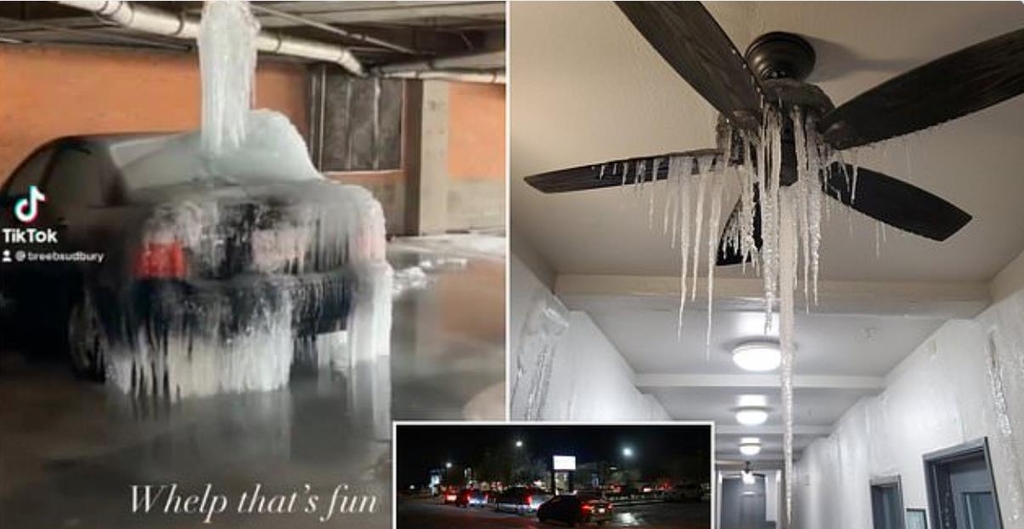 텍사스 수도관 동파로 얼어붙은 차량, 아파트 복도 선풍기에 매달린 고드름 [트위터 게시물 캡처]