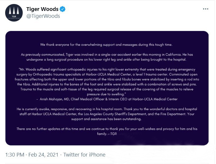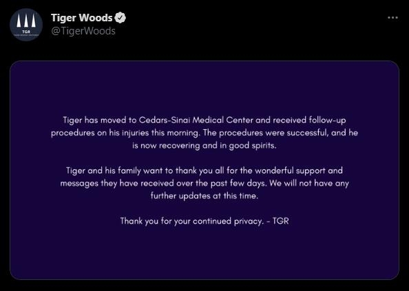 우즈의 트위터 계정에 올라온 글은 "타이거가 시더스 사이나이 메디컬센터로 옮겼으며 오늘 아침 부상들에 대해 후속 수술을 받았다"며 "수술은 성공적이었고 그는 지금 회복 중이며 기분이 좋다"라고 돼 있다.