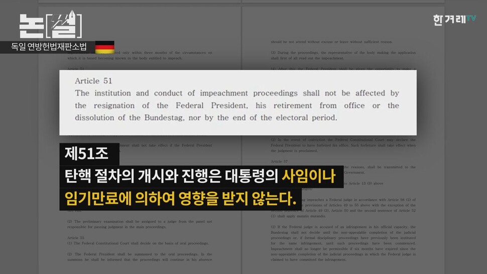 미국 사례 이야기가 길어졌는데요. 독일의 경우에는 연방헌법재판소법에 명문 규정을 둬 이 문제를 간명하게 해결했습니다. 대통령 탄핵에 관한 규정(제51조)에서 “탄핵 절차의 개시와 진행은 대통령의 사임이나 임기만료에 의하여 영향을 받지 않는다”고 명시했습니다.