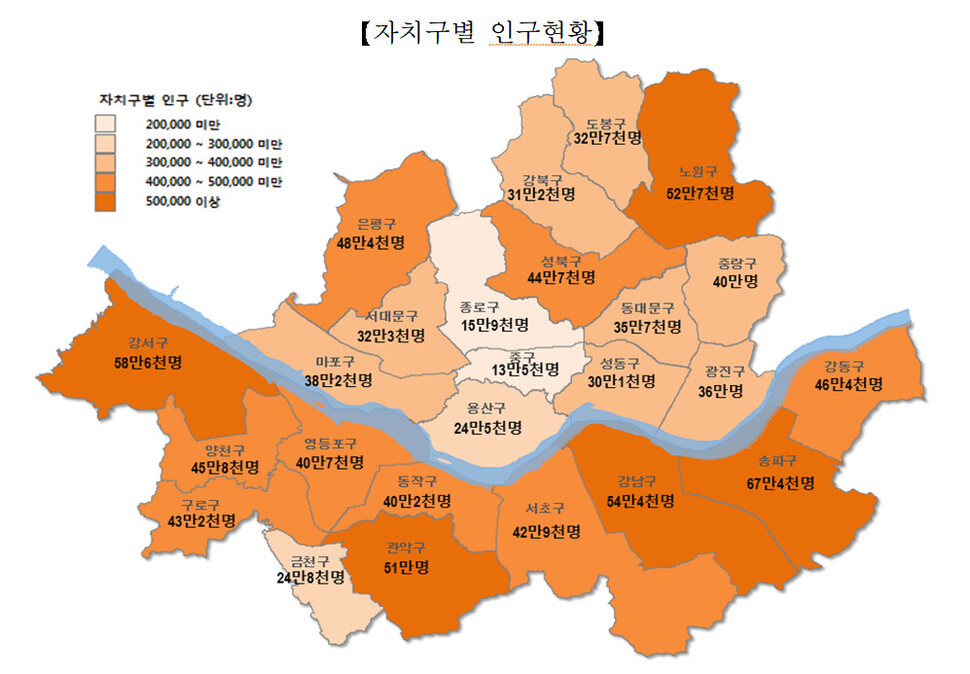 서울시 자치구별 등록인구.