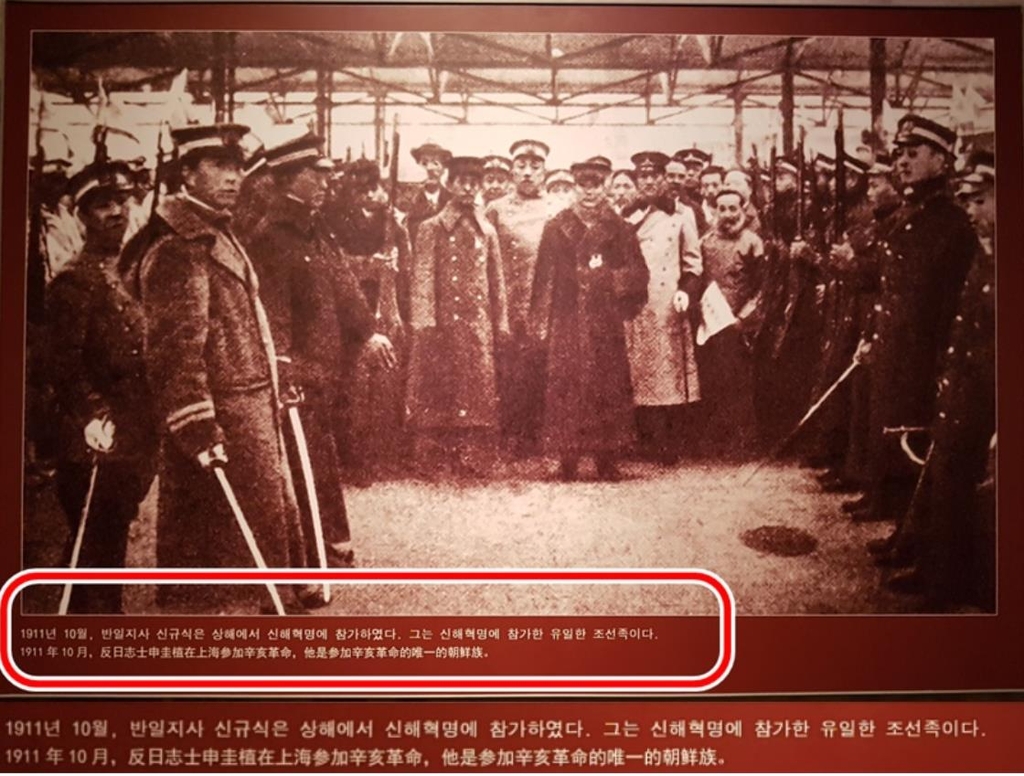 중국 옌볜박물관 '조선족 혁명투쟁사' 전시: 지난해 중국 지린성 옌볜(延邊)조선족자치주 옌지(延吉) 옌볜박물관의 '조선족 혁명투쟁사' 상설 전시실 내 전시물. 사진 하단에 "반일지사 신규식은 상해에서 신해혁명에 참가했다. 그는 신해혁명에 참가한 유일한 조선족이다"라고 적혀있다.