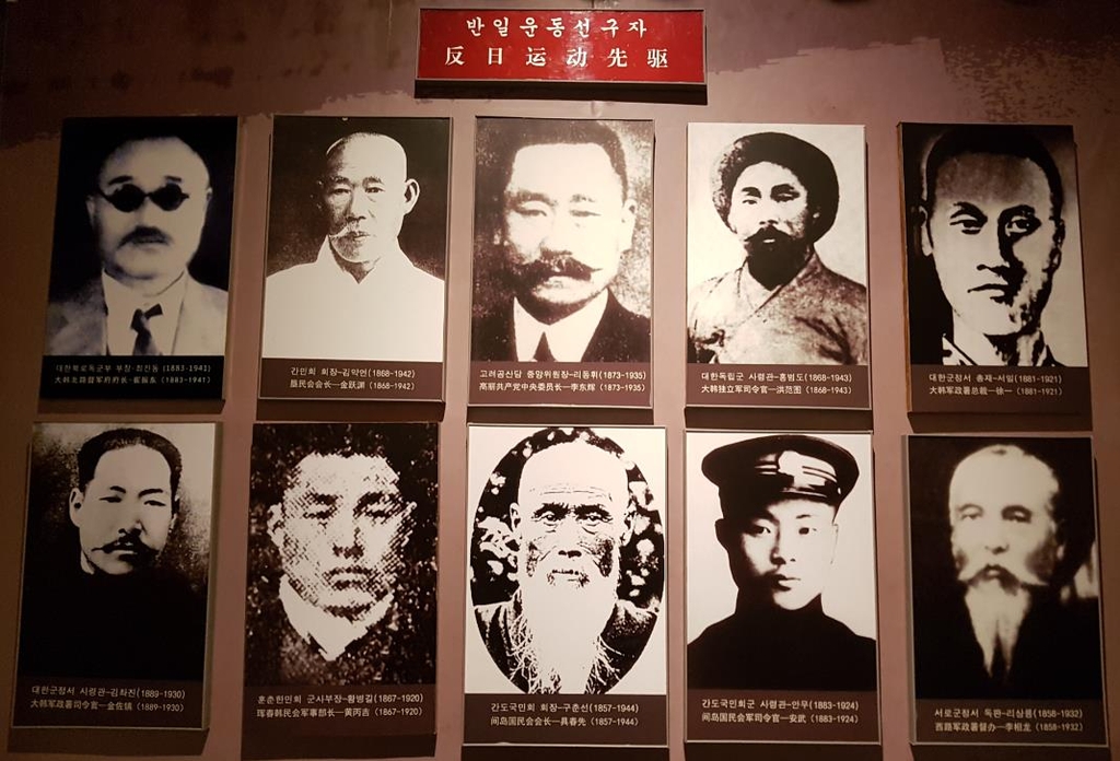 중국 옌볜박물관 '조선족 혁명투쟁사' 전시 : 지난해 중국 지린성 옌볜(延邊)조선족자치주 옌지(延吉) 옌볜박물관의 '조선족 혁명투쟁사' 상설 전시실 내 전시물. 사진 왼쪽 상단부터 최진동·김약연·이동휘·홍범도·서일·김좌진·황병길·구춘선·안무·리상룡 등 독립운동가들이 소개돼있다.