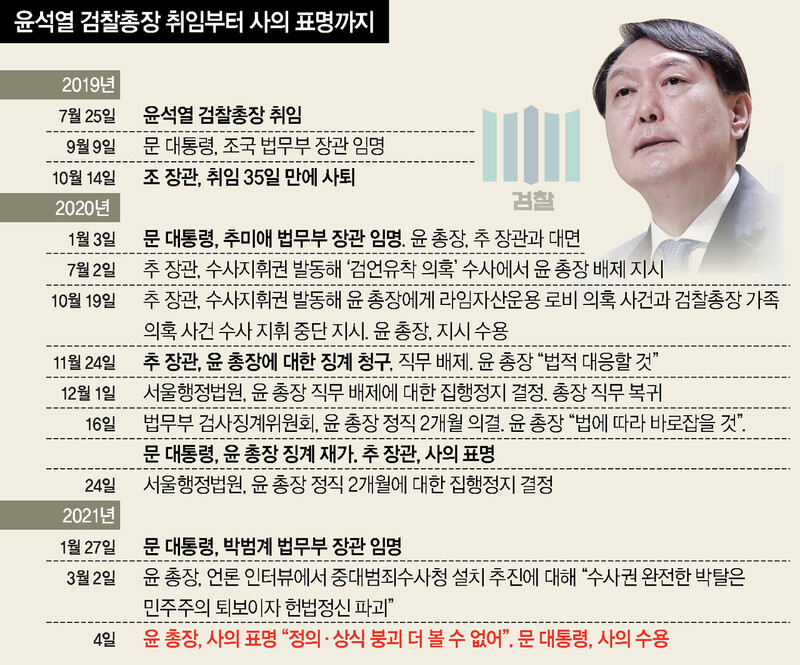 윤석열 검찰총장이 4일 전격 사퇴한 표면적인 이유는 여당에서 추진 중인 ‘중대범죄수사청(수사청) 신설’이다. 부정부패에 강력히 대응하는 것이 국가와 정부의 헌법상 의무인데, 수사청을 세워 “검찰의 수사권을 완전히 박탈하면, 검찰이 파괴되고 반부패 시스템이 붕괴”된다는 주장이다. 이 연장선에서 그는 사의를 밝히며 “나라를 지탱해온 헌법정신과 법치 시스템이 파괴되고 있다. 그 피해는 고스란히 국민에게 돌아갈 것”이라고 날을 세웠다.
