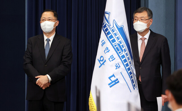 4일 임명된 김진국 대통령비서실 민정수석비서관(왼쪽)이 청와대 춘추관에서 인사말을 하기 위해 전임 신현수 수석과 대기하고 있다. 연합뉴스