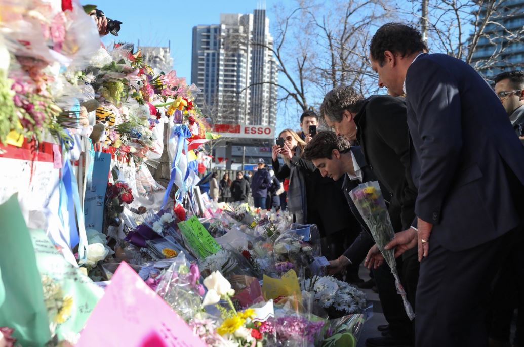 2018년 4월 24일 토론토 노스욕에서 시민들이 미나시안의 트럭 돌진 사건으로 숨진 희생자들을 추모하고 있다.