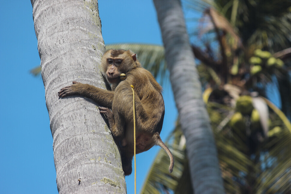 코코넛 수확에 동원되는 원숭이들은 보통 돼지꼬리원숭이(pig-tailed macaque)로 어린시절 이른바 원숭이학교에서 조련된다. 처음에는 길지 않은 장대에 코코넛을 묶어놓고 따는 연습을 하다 차츰 고도를 높여가는 식이다.