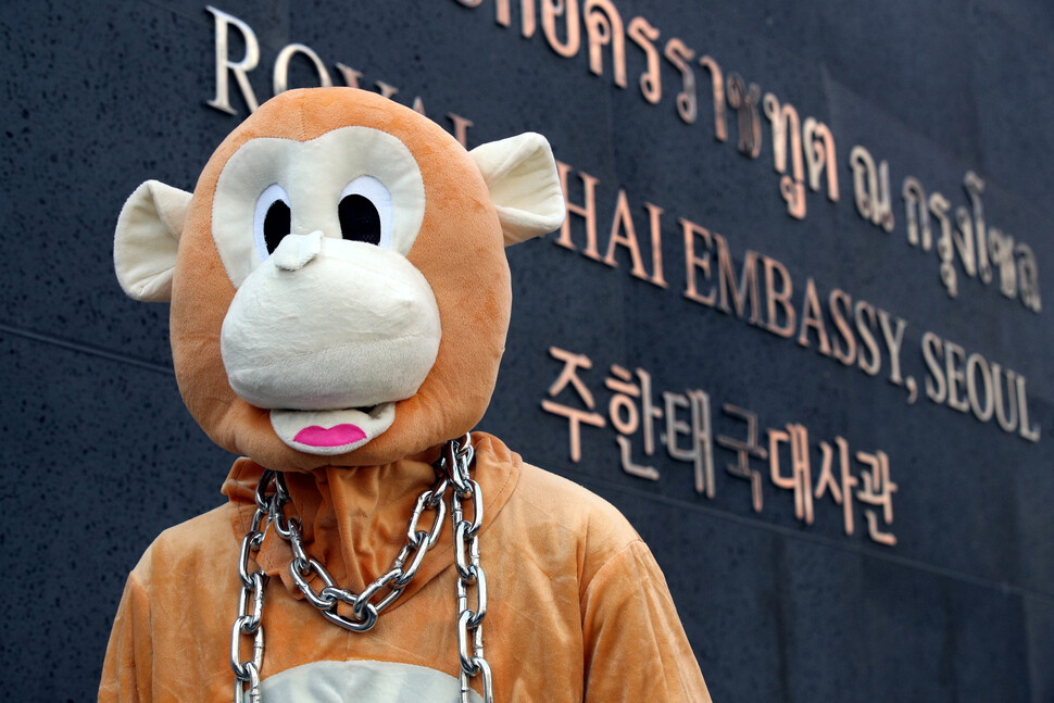 동물권 활동가들, 타이대사관 앞서 원숭이노동 항의 퍼포먼스