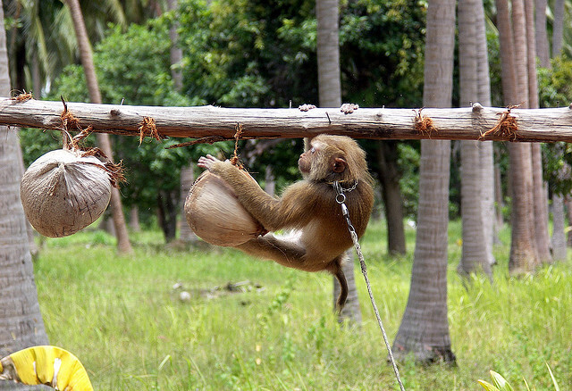 원숭이 학교에서 야자 따는 훈련을 받는 새끼 원숭이. 크리에이티브 코먼즈