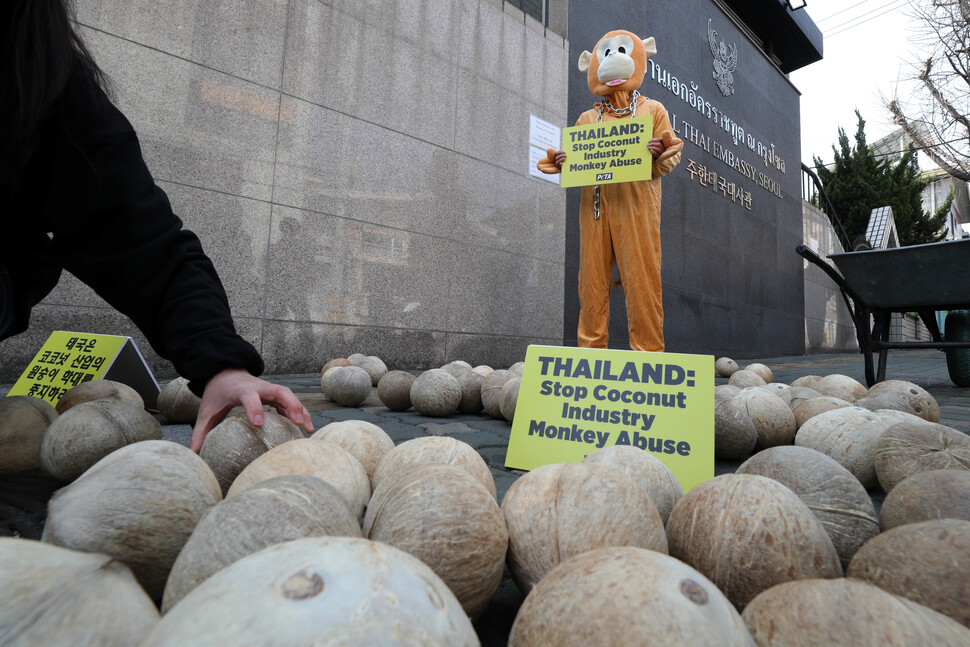 타이대사관에 코코넛을 버리는 퍼포먼스를 벌인 이들은 미국 동물권단체 ‘동물을 윤리적으로 대하려는 사람들’(PETA·페타)을 지지하는 이들로, 국내서 활동 중인 개인 동물권활동가들이다. 이들은 “태국대사에게 태국의 코코넛 산업이 원숭이의 노동을 착취하고 있음을 알리는 메시지를 전달하고 경각심을 불러일으키기 위해 기획했다”고 밝혔다.