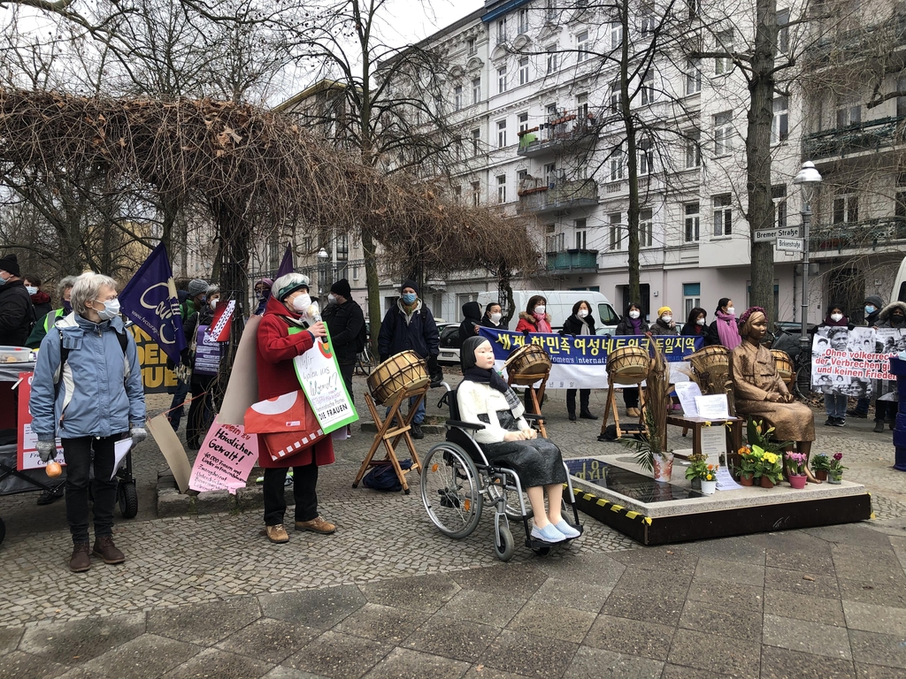 한정화 코리아협의회 대표는 이날 집회에서 "오늘은 처음으로 베를린 평화의 소녀상 앞에서 독일 시민들과 함께 여성의 날을 축하하게 된 날이라는 점에서 매우 의미가 있다"면서 "이는 전쟁범죄에 대한 침묵과 부정은 이제 끝나야 한다고 선언하는 것"이라고 말했다.