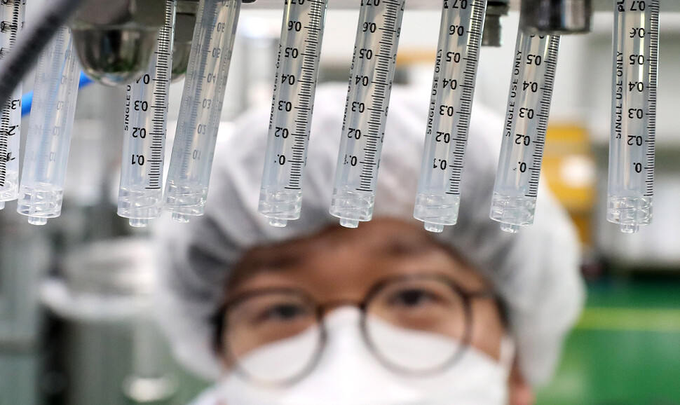질병관리청이 국내에서 사용되고 있는 신종 코로나바이러스 감염증(코로나19) 백신 1바이알(병)당 접종인원을 현장에서 1∼2명 늘릴 수 있도록 허용했다. 사진은 전북 군산시 풍림파마텍에서 지난 18일 업체 직원들이 최소잔여형(LDS) 주사기를 생산하는 모습. 연합뉴스