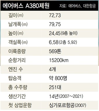 14년 전인 2007년 10월 첫 상업비행을 시작할 때만 해도, 이 항공기는 일류 항공사의 상징으로 통했다. 1970년 상업운항을 시작한 이후 40년 가까이 ‘하늘의 궁전’으로 불렸던 경쟁자 보잉747은 A380에 자연스레 밀려날 운명이었다.