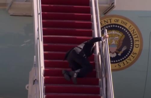 살짝 휘청거린 정도라 바이든 대통령은 이내 중심을 잡고 계단을 다시 오르려 했지만 두어 계단도 오르기 전에 거의 넘어지듯 중심을 잃었다.