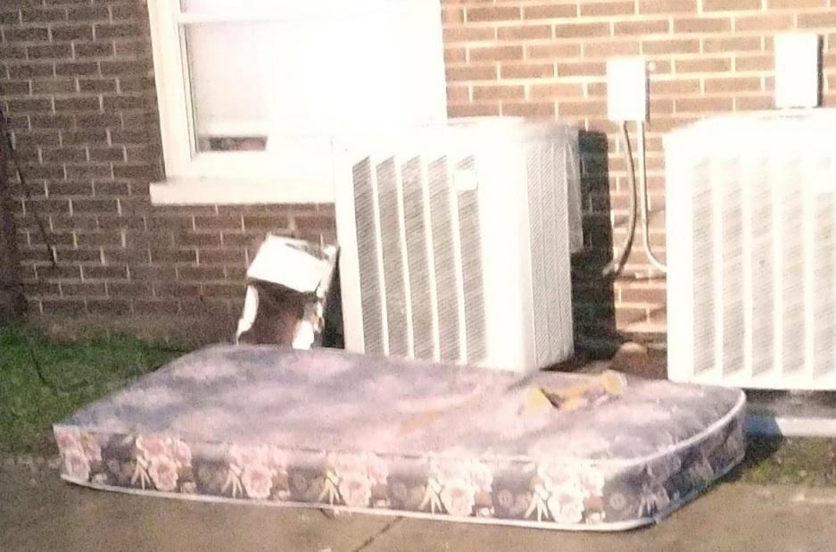 미국 8살 소녀가 뛰어내린 3층 아파트: 3층 아파트 밑에 매트리스가 있다. 시카고 소방서 제공.