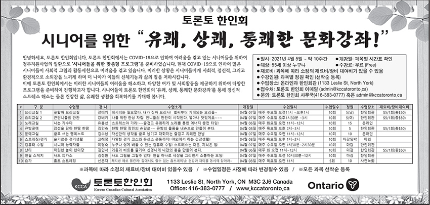 토론토 한인회가 COVID-19로 인해 활동이 부족한 시니어들을 위해 온타리오 주정부 지원으로 개설하는 맞춤형 시니어 프로그램이 4월5일 개강, 약 10주 동안 진행된다.