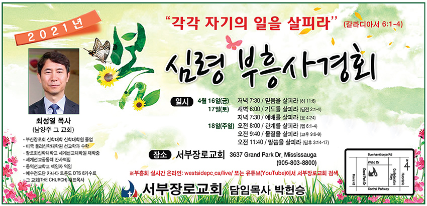 서부장로교회(담임 박헌승 목사: 3637 Grand Park Dr. Mississauga, L5B 4L6)가 2021 봄 심령부흥 사경회를 최성열 목사(남양주 그 교회 대표목사)를 강사로 4월16일(금)부터 18일 주일까지 개최한다.