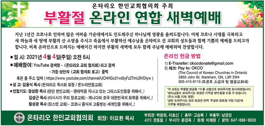한편 온타리오 한인교회협의회(회장 이요환 소금과 빛 염광교회 담임목사)가 주최하는 부활절 연합 새벽예배는 올해 처음 온라인으로 유튜브(Youtube)를 활용해 4일 부활주일 새벽 6시부터 드리게 된다.
