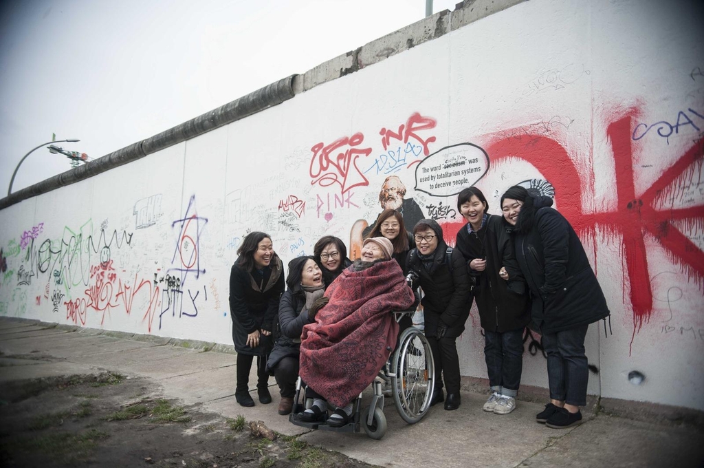 베를린 장벽 앞에서 활짝 웃는 길원옥 할머니: 길원옥 할머니가 2017년 12월 독일 베를린 방문 당시 베를린장벽 앞에서 재독시민사회단체 활동가들과 윤미향 당시 정대협 대표와 기념사진을 찍고 있다.[코리아협의회제공=연합뉴스]