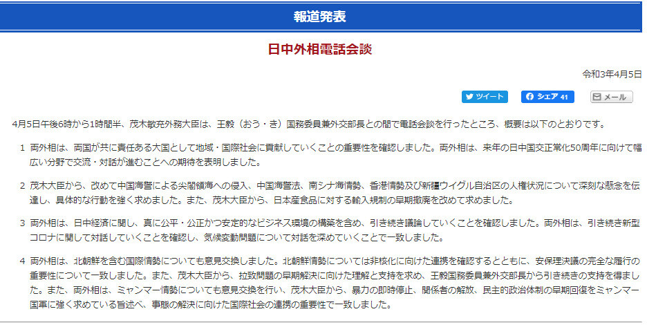 1. 4월5일 오후 6시부터 1시간 반, 모테기 도시미쓰 외무대신은 왕이 국무위원 겸 외무장관과 전화회담을 했다. 개요는 아래와 같다.