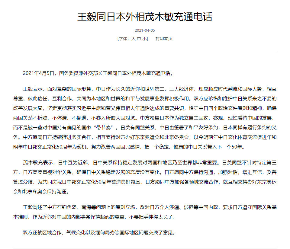 2021년 4월5일 국무위원 겸 외교부장 왕이가 일본 외상 모테기 도시미쓰와 통화했다.