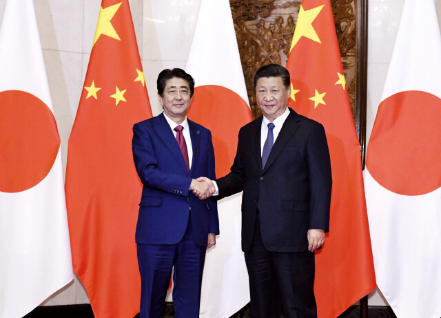 시진핑 중국 국가주석(오른쪽)과 아베 신조 일본 총리가 2018년 10월26일 베이징 조어대 국빈관에서 정상회담 전 악수하고 있다. 두 정상은 경제협력 및 양국 관계 개선에 합의하고, 북한 비핵화 달성을 비롯한 동북아 역내 안정을 위한 공동 노력에 공감대를 형성했다. 베이징/AP 연합뉴스