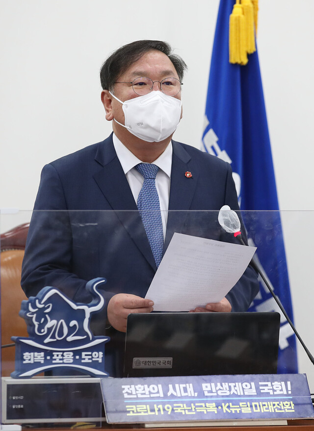 더불어민주당 김태년 당대표 직무대행이 8일 국회에서 열린 화상 의원총회에서 발언하고 있다. 연합뉴스