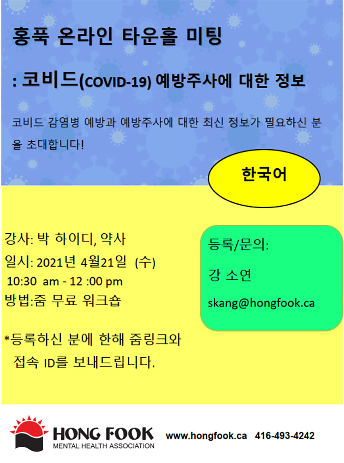 홍푹정신건강협회가 COVID-19 백신에 대해 설명하고 궁금증을 풀어 줄 ‘COVID-19 예방주사에 대한 정보 온라인 타훈홀 미팅’을 4월21일(수) 오전 10시30분부터 12시까지 진행한다.
