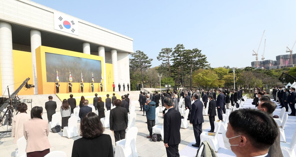 제102주년 대한민국임시정부 수립 기념식: 11일 오전 서울 용산구 백범김구기념관 야외광장에서 열린 제102주년 대한민국임시정부 수립 기념식에서 참석자들이 국민의례를 하고 있다.
