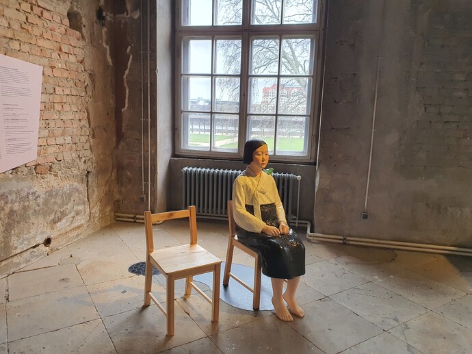 그러나 이번 전시에서 가장 눈에 띄는 것은 전시장 안팎에 자리한 소녀상이다. 전시장 안에는 2017년 서울시내버스를 탔던 소녀상이, 전시장 바깥 마당에는 평화의 소녀상이 놓였다. 1년을 준비해온 이번 전시에서는 애초 가벼운 버스 소녀상만 설치될 예정이었다. 그러나 지난해 베를린 소녀상 설치과정의 진통을 지켜본 드레스덴 민속박물관 쪽은 이번 드레스덴 전시에서 베를린과 같은 소녀상을 전시장 밖에도 설치하자는 독-한 단체의 제안을 기꺼이 받아들였다고 한다. 박물관 내 소녀상은 이번 전시가 종료된 뒤에도 내년 4월15일까지 존치된다.