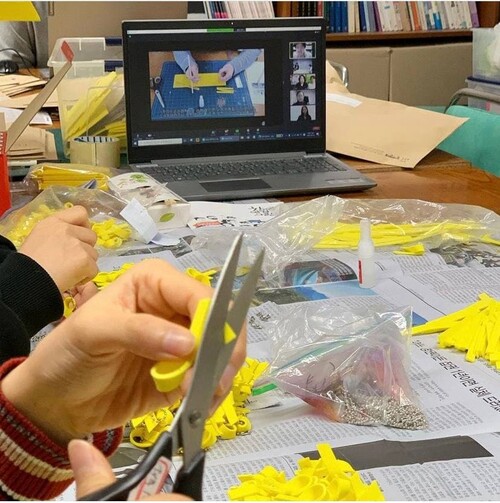 서촌노란리본공작소에서 시민들이 세월호 참사 7주기를 추모하기 위해 나눠줄 노란리본을 제작하고 있다. 부산과 전주지역 시민들이 온라인을 통해 함께 참여했다. <참여연대> 제공