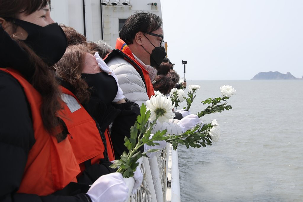 유가족들은 3015함 탑승이 시작된 오전 7시께만 하더라도 평소와 크게 다르지 않게 담담한 모습을 보이기도 했지만, 해경 전용부두를 출발하고 약 96㎞ 항로를 이동해 사고해역에 도착할 즈음에는 흰 장갑이 눈물에 젖어 들기 시작했다.