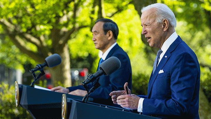 바이든 대통령은 이날 회담 뒤 백악관 로즈가든에서 연 공동 기자회견에서 “미-일 동맹에 대한 철통같은 지지를 재확인했다”고 밝혔다. 이어 우리는 “우리는 자유롭고 개방된 인도·태평양의 미래를 보장하기 위해 중국으로부터의 도전 과제와 동중국해, 남중국해는 물론 북한 같은 문제에 대응하는 데 있어 협력하기로 했다”고 말했다. 그는 “일본과 미국은 그 지역(인도·태평양)에서 강력한 두 민주주의 국가이고, 우리는 인권과 법치를 포함해 공동의 가치를 수호하고 진전시키는 데 전념하고 있다”며 이렇게 말했다. 스가 총리도 “우리는 인도·태평양 지역과 세계 전반의 평화와 번영에 미치는 중국의 영향에 대해 진지하게 논의했다”며 “동중국해나 남중국해에서의 힘에 의한 현상 변경 시도, 그리고 타자에 의한 위압에 반대하기로 합의했다”고 말했다.