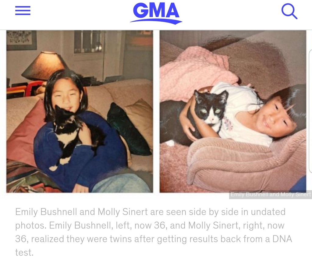 자신과 DNA가 49.96% 일치한다는 그 소녀는 필라델피아에 거주하는 에밀리 부슈널이라는 여성의 딸이었고, 알고 보니 자신과 이 에밀리라는 여성이 일란성 쌍둥이 자매지간이었던 것이다.