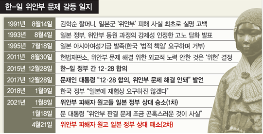 이후 2021년 1월8일 모두의 예상을 뒤집는 법원 판결이 나왔다. 법원이 국제 관습법상의 주권면제(국가면제) 원칙을 깨고, 일본 정부가 위안부 피해자들에게 배상해야 한다고 판결(1차 판결)한 것이다. 하지만 문재인 대통령은 신년 기자회견에서 이 판결에 대해 “조금 곤혹스러운 것이 사실”이라고 말했고, 법원은 지난달 말 승소한 원고들이 일본 정부 자산을 강제집행할 길을 막았다.