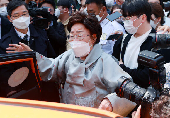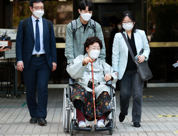 21일 서울 서초구 중앙지방법원에서 위안부 피해자 2차 손배소 선고 공판을 마치고 나온 이용수 할머니.