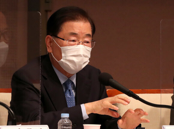 정의용 외교부 장관이 21일 서울 한국프레스센터에서 열린 관훈토론회에서 패널들의 질문에 답변하고 있다. 연합뉴스