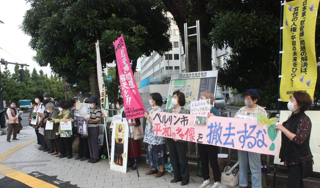 일본의 시민단체인 '일본군 위안부 문제 해결 전국행동'(이하 전국행동)은 지난해 10월 13일 도쿄도(東京都)에 있는 총리관저 앞에서 집회를 갖고 일본 정부에 베를린시에 건립된 '평화의 소녀상' 철거 요청을 즉각 철회하라고 촉구했다. 이 단체의 양징자(梁澄子) 공동대표가 연설하는 모습.
