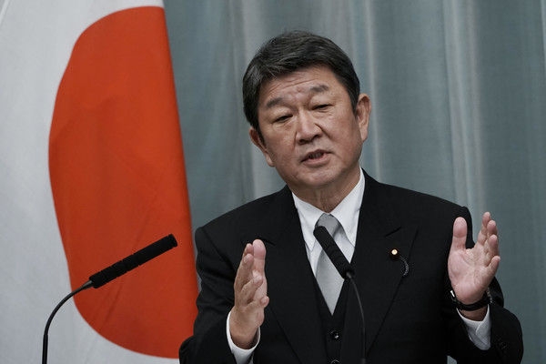 모테기 도시미쓰 일본 외무상이 23일 오후 정례 기자회견을 하고 있다. [외무성 유튜브 중계 화면 갈무리]