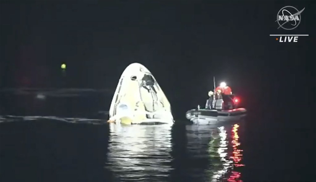이번 귀환은 작년과 달리 심야에 이뤄졌다. 우주정거장에서 출발해 6시간 30분 비행 끝에 지구로 진입한 크루 드래건은 낙하산 네 개를 펴고 칠흑 같은 밤바다에 무사히 닿았다.